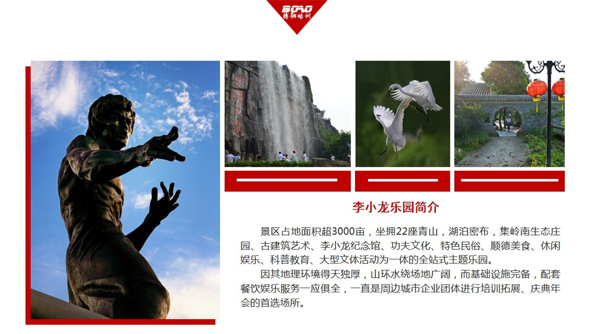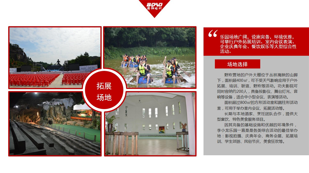 因其完備的基礎(chǔ)設(shè)施和優(yōu)越的環(huán)境條件,李小龍樂園一直是是各類綜合活動(dòng)的最佳舉辦地:影視拍攝、慶典年會(huì)、商務(wù)會(huì)展、拓展培訓(xùn)、學(xué)生郊游、民俗節(jié)慶、美食狂歡等。