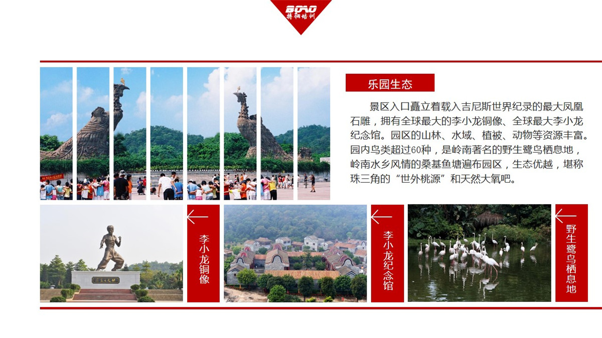 佛山順德李小龍樂園景區(qū)占地面積超3000畝,坐擁22座青山,湖泊密布,集嶺南生態(tài)莊園、古建筑藝術(shù)、李小龍紀(jì)念館、功夫文化、特色民俗、順德美食、休閑娛樂、科普教育、大型文體活動(dòng)為一體的全站式主題樂園。