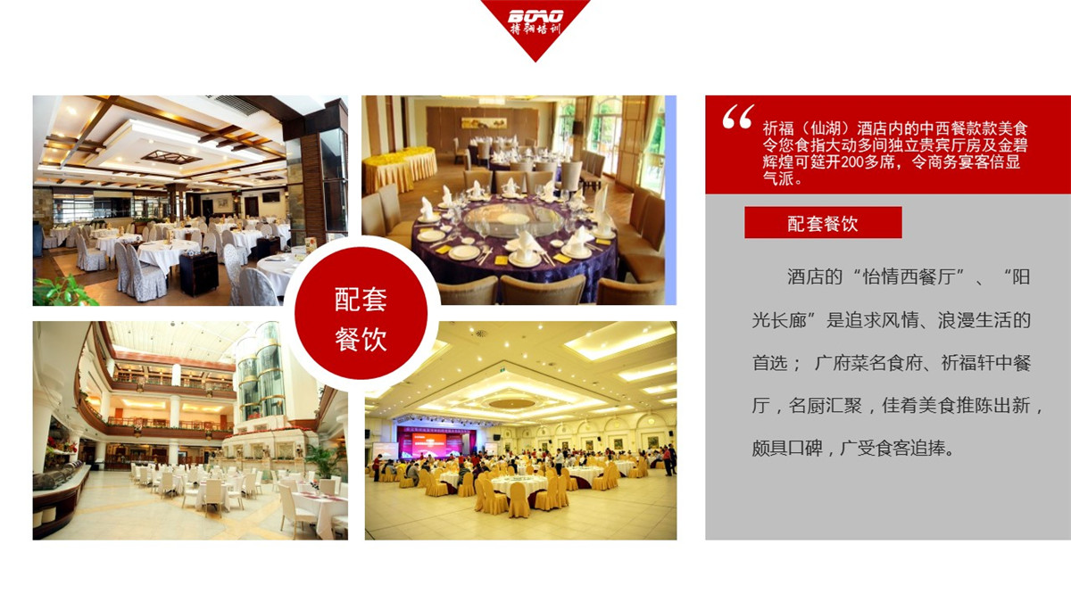 祈福(仙湖)酒店內(nèi)的中西餐款款美食令您食指大動多間獨立貴賓廳房及金碧輝煌可筵開200多席,令商務宴客倍顯氣派。