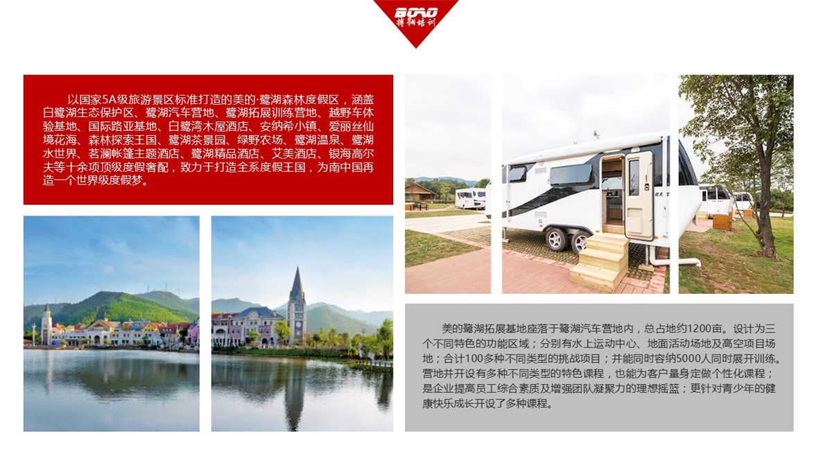 拓展訓(xùn)練營地座落于鷺湖汽車營地內(nèi),總占地約1200畝。設(shè)計(jì)為三個(gè)不同特色的功能區(qū)域;分別有水上運(yùn)動(dòng)中心、地面活動(dòng)場地及高空項(xiàng)目場地;合計(jì)100多種不同類型的挑戰(zhàn)項(xiàng)目;并能同時(shí)容納5000人同時(shí)展開訓(xùn)練。營地并開設(shè)有多種不同類型的特色課程,也能為客戶量身定做個(gè)性化課程;是企業(yè)提高員工綜合素質(zhì)及增強(qiáng)團(tuán)隊(duì)凝聚力的理想搖籃;更針對青少年的健康快樂成長開設(shè)了多種課程。營地配備了20多名專業(yè)教練,部分教練從業(yè)時(shí)間均在10年以上,確保達(dá)到預(yù)期的訓(xùn)練效果。綜合眾多條件旨在打造南中國最大的戶外教育及戶外活動(dòng)理想場所。優(yōu)質(zhì)的服務(wù)、完善的配套、強(qiáng)大的專業(yè)團(tuán)隊(duì)是您“美的”的選擇。