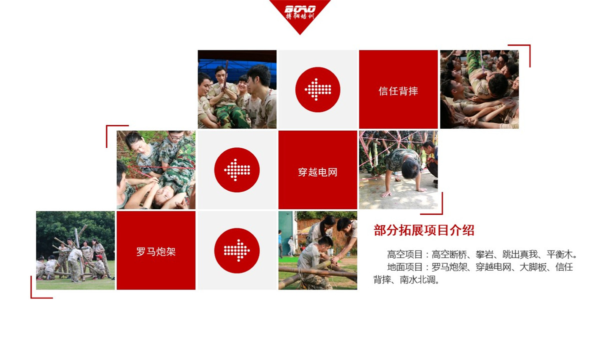 地面項(xiàng)目:羅馬炮架、穿越電網(wǎng)、大腳板、信任背摔、南水北調(diào)