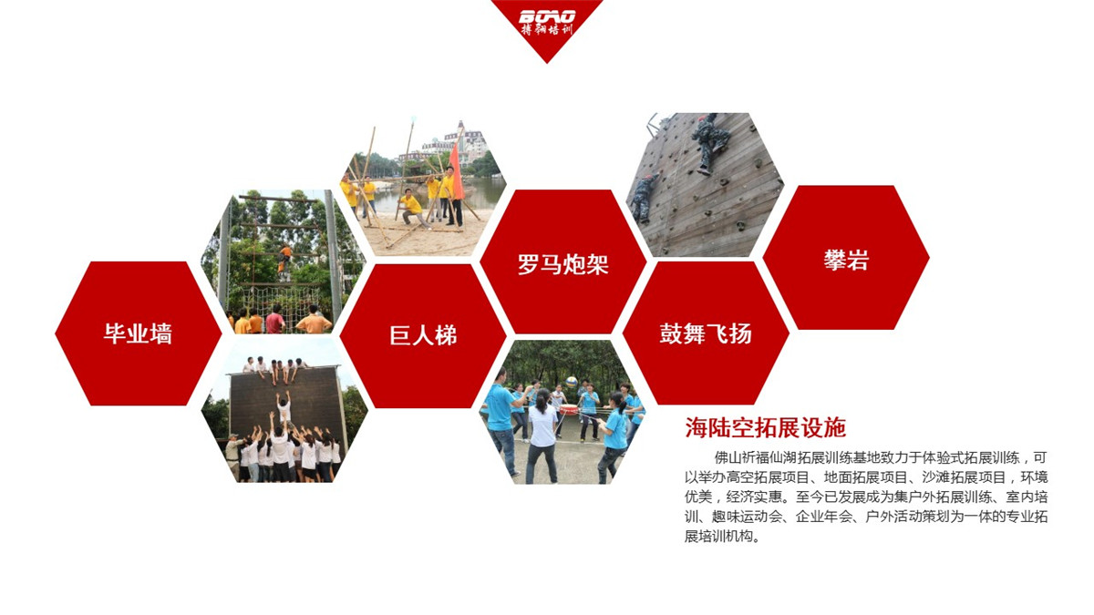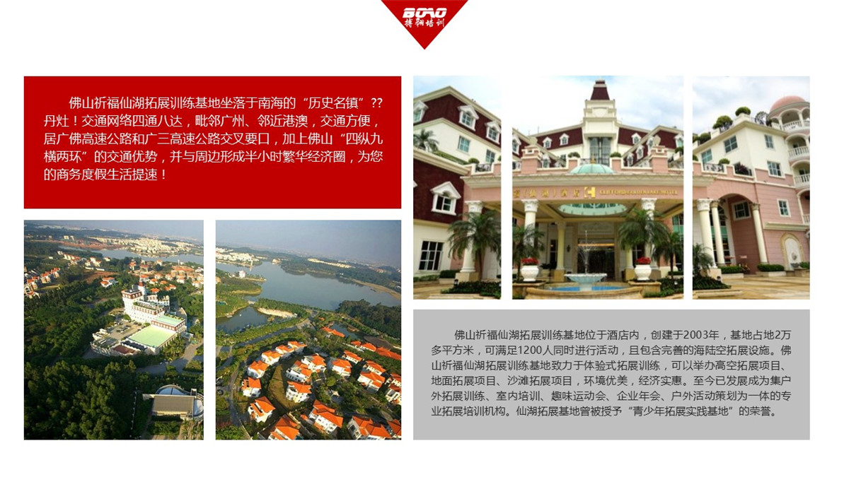 佛山祈福仙湖拓展基地 位于酒店內(nèi),創(chuàng)建于2003年,基地占地2萬多平方米,可滿足1200人同時進行活動,且包含完善的海陸空拓展設施。佛山祈福仙湖拓展訓練基地致力于體驗式拓展訓練,可以舉辦高空拓展項目、地面拓展項目、沙灘拓展項目,環(huán)境優(yōu)美,經(jīng)濟實惠。至今已發(fā)展成為集戶外拓展訓練、室內(nèi)培訓、趣味運動會、企業(yè)年會、戶外活動策劃為一體的專業(yè)拓展培訓機構。仙湖拓展基地曾被授予“青少年拓展實踐基地”的榮譽。