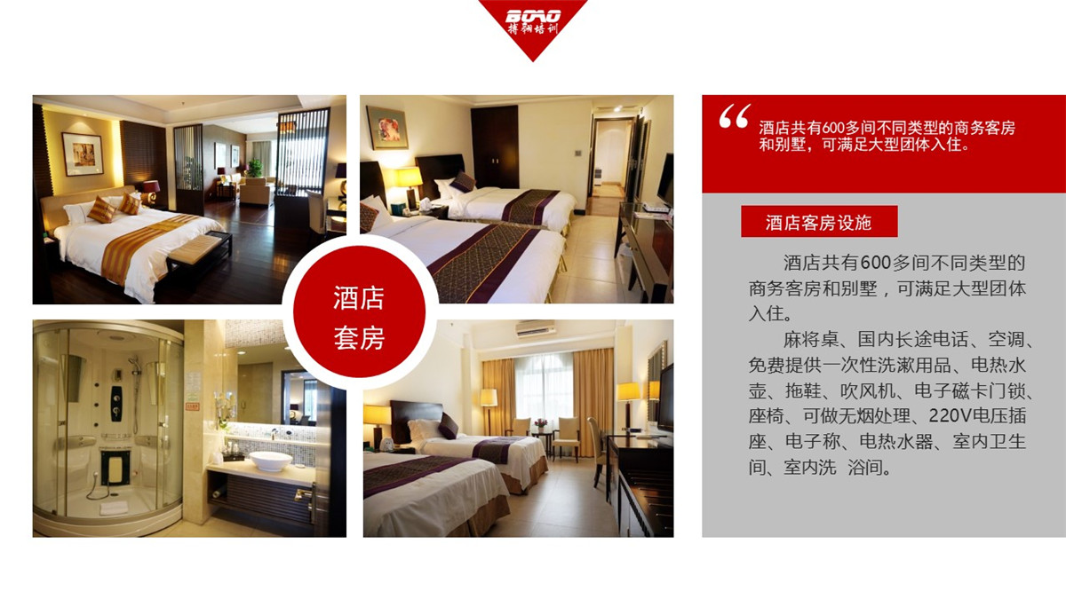 酒店共有600多間不同類型的商務客房和別墅,可滿足大型團體入住。